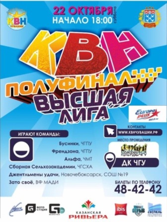 В субботу, 22 октября, в Дворце культуры ЧГУ состоится полуфинал Высшей Студентческой лиги КВН Чувашии! До этого этапа дошли семь команд, которые и будут бороться за выход в Финал!