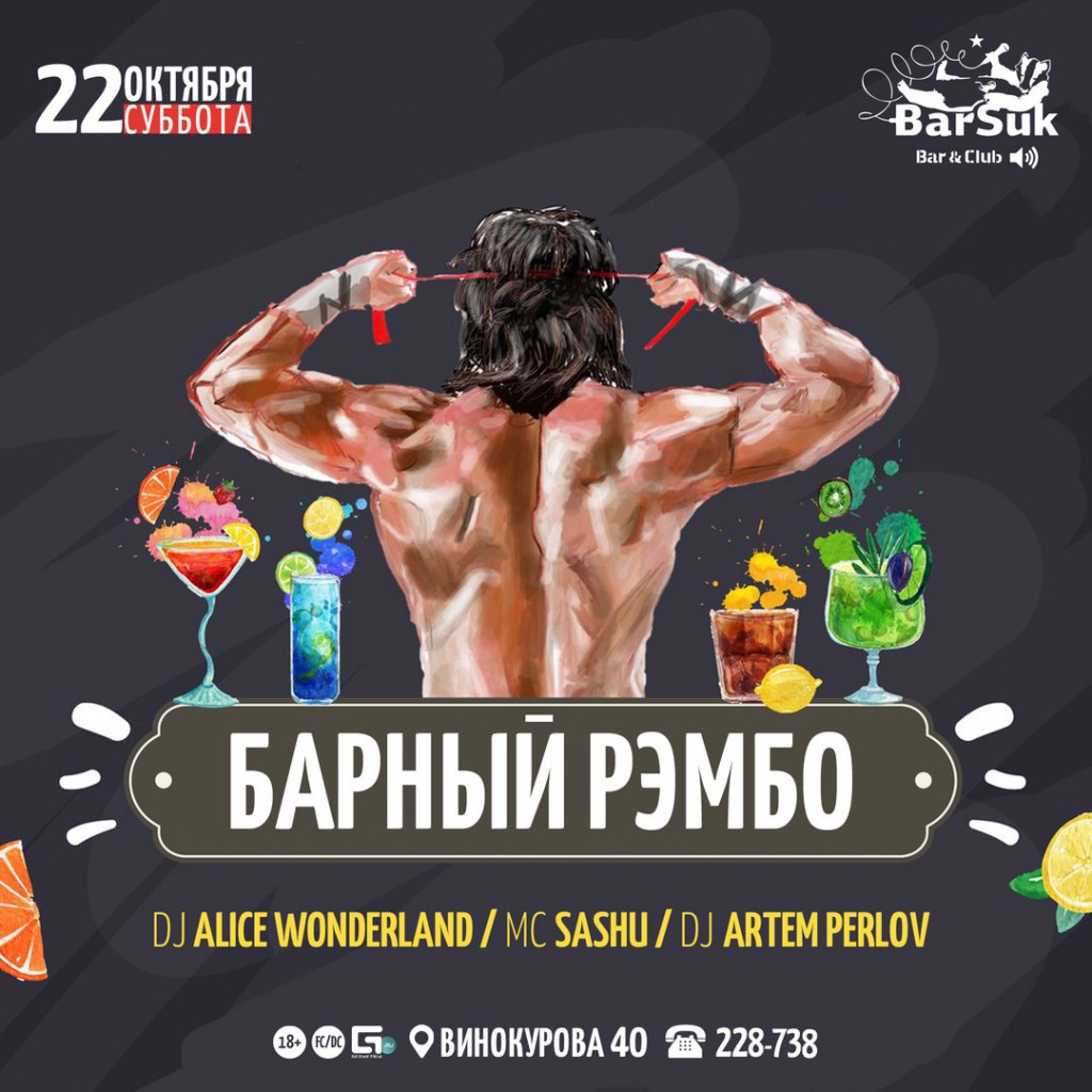 В субботу, 22 октября, в Bar & Club Barsuk вечеринка "Барный Рэмбо". Играют DJ Dis Que, DJ Igor Shevchenko, DJ Alice Wonderland, DJ Artem Perlov.