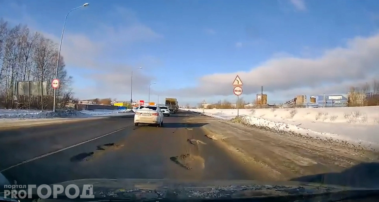 На трассе М-7 в районе Лапсар столько ям и выбоин, что местами их нельзя объехать