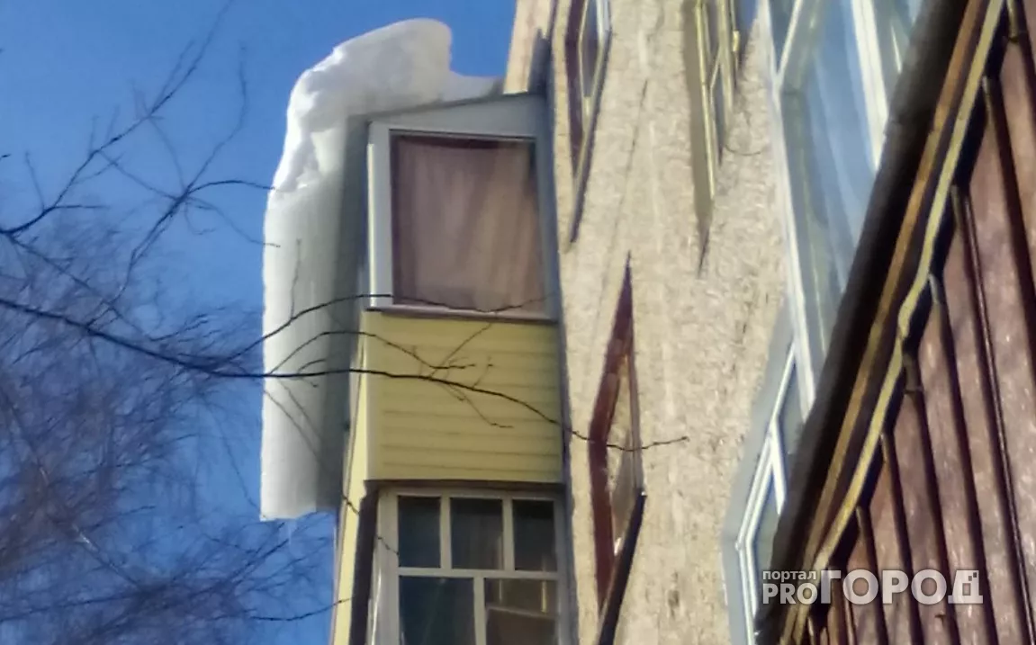 Снежная глыба нависла над проходящими мимо жилого дома в Чебоксарах.