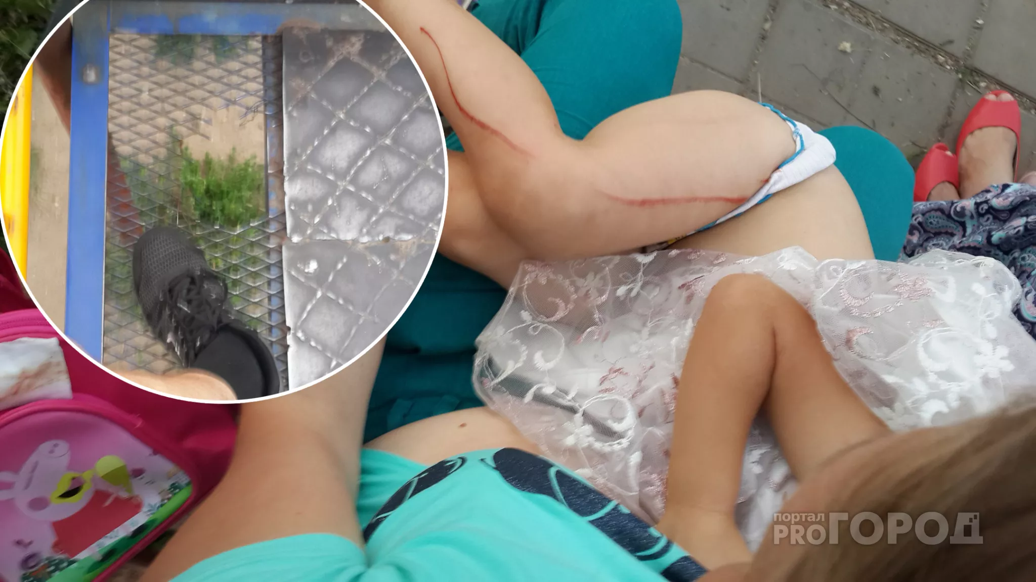 Напольное покрытие детской площадки состоит из железной толстой сетки. Там оказалась дыра с торчащими проволоками, в которую и провалился ногой ребенок. В результате девочка получила повреждение верхних тканей ноги в виде царапины от бедра до лодыжки. К счастью, медицинская помощь не понадобилась.
