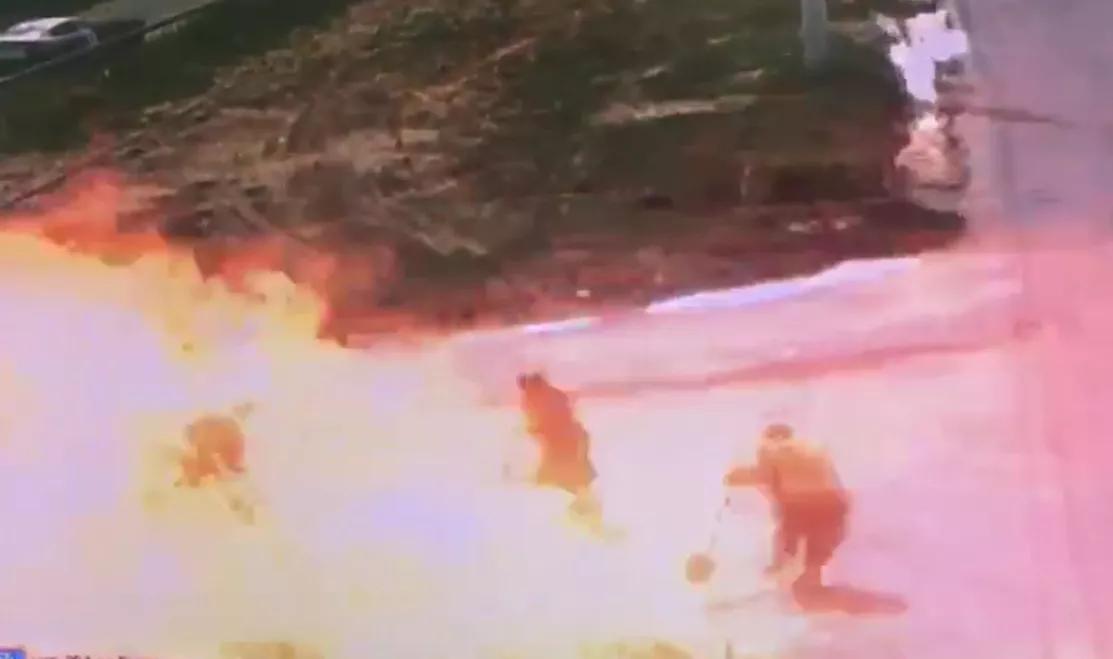Момент взрыва попал на камеру наблюдения. На видео заметно, что около котлована стоит 4 человека: 2 женщины и двое мужчин. В это время спецтехника опускает ковш в котлован. Через некоторое время от ковша резко отбегает женщина в белом. Через 3 секунды из-под земли вырывается фонтан пламени, а люди разбегаются в разные стороны.