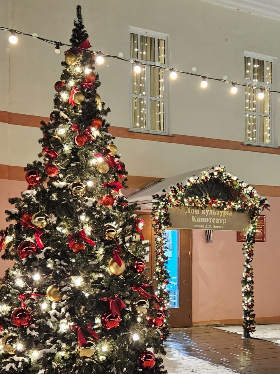 Елка в Мариинском Посаде украшена возле Дома культуры. Ее нарядили в золотисто-красной гамме с использованием бантов и гирлянд.