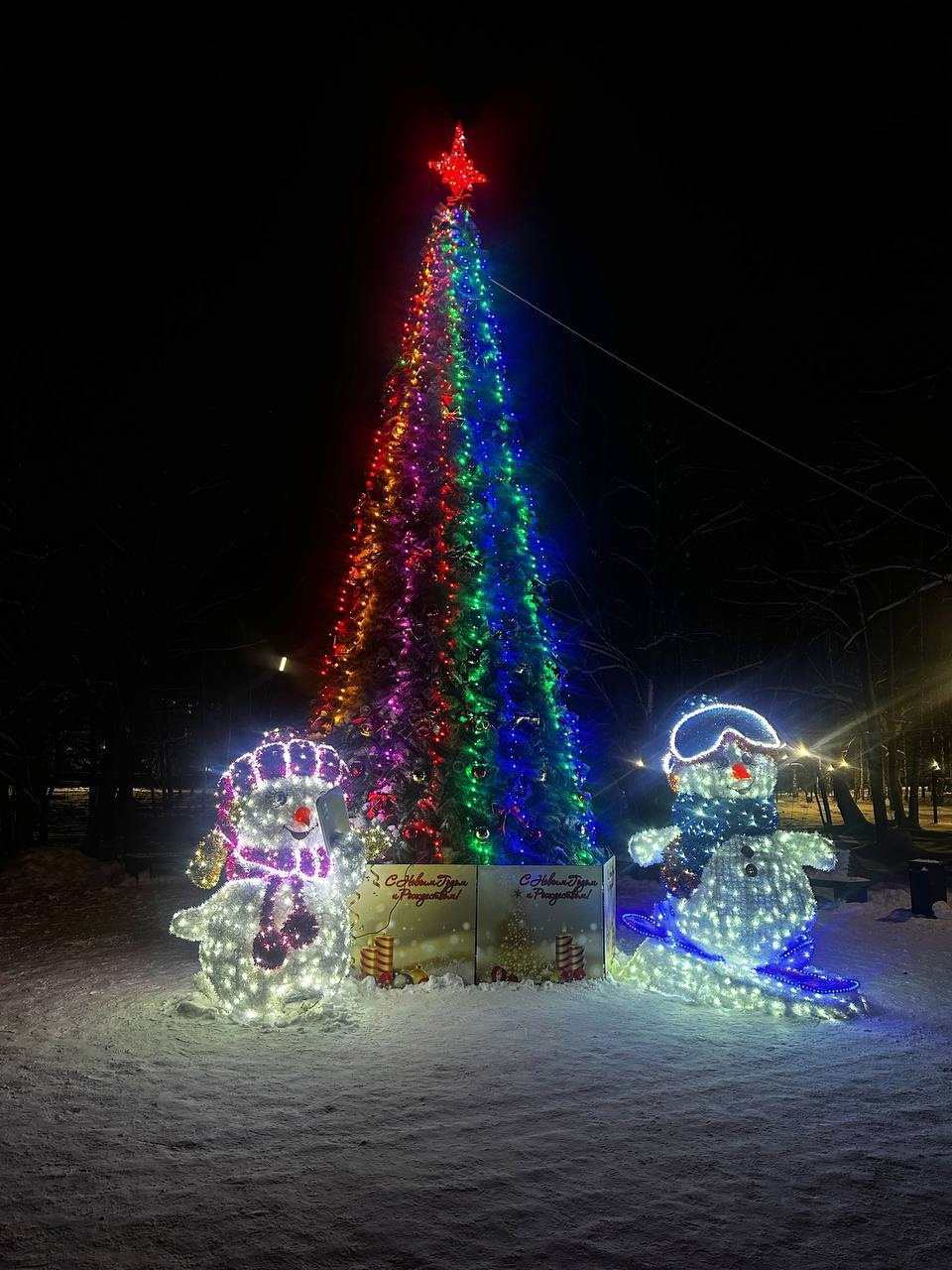 В Шумерле елка сверкает своими огнями возле Молодежного центра "Дружба". Праздничную композицию дополнили световыми фигурами снеговиков.