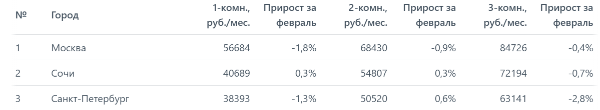 Ситуация с двухкомнатными квартирами схожая. В 52 городах из 70 арендная плата уменьшилась. Самое значительное падение цен отмечено в Тольятти, Кирове и Иваново. В столице "двушки" подешевели на 0,9 %, а в Петербурге, наоборот, подорожали на 0,6 %.