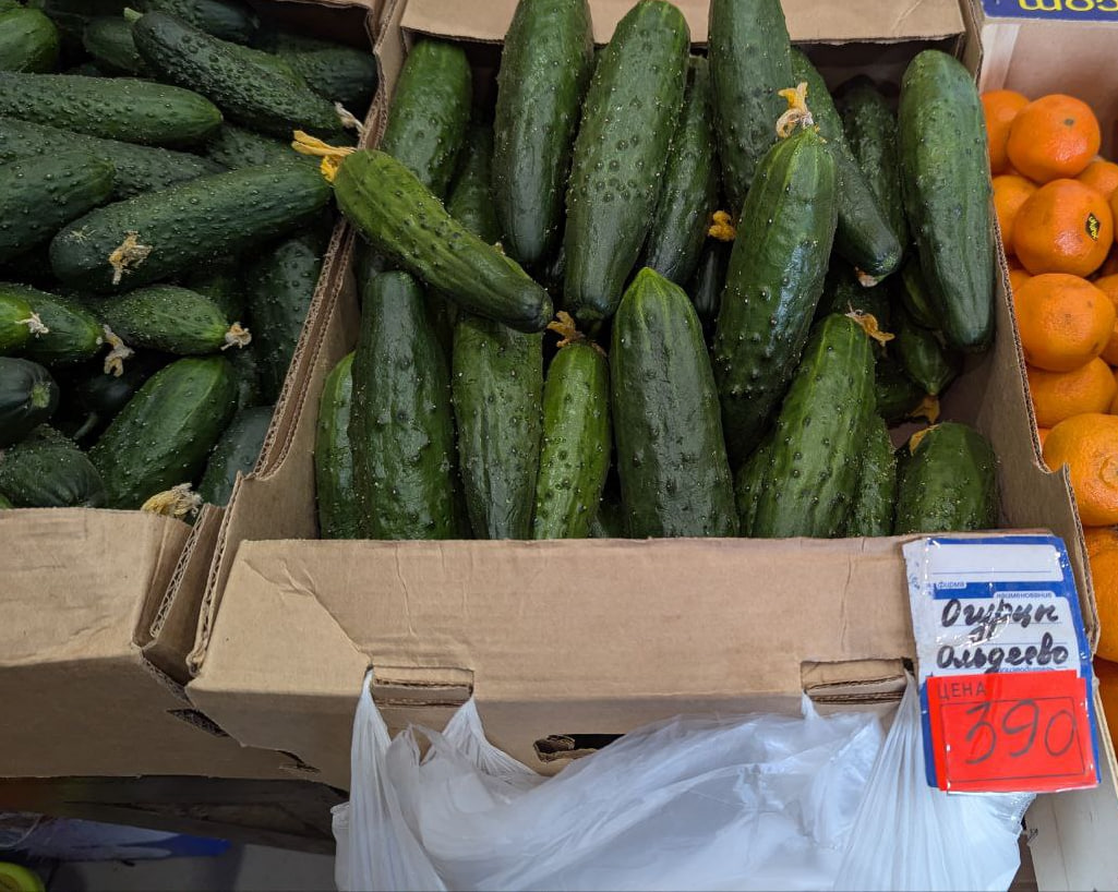 Но вот овощные лавки огуречный ценопад не затронул. Здесь местные тепличные огурцы можно найти по цене 390 рублей за килограмм, стоимость относительно прошлого месяца не поменялась. Это существенно дороже, чем в сетевых магазинах, но такие овощи часто пользуются спросом у тех, кто ищет продукты от местного производителя.