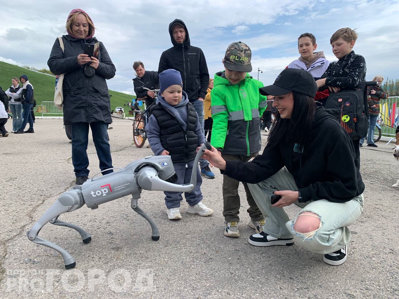 В параде участвовала робособака "Топчик". Пес особенно привлекал внимание детей, а также сородичей из крови и плоти, большинство из которых вели себя настороженно с непонятным существом, но были и такие, которые проявляли дружелюбие, желали поиграть с "Топчиком".