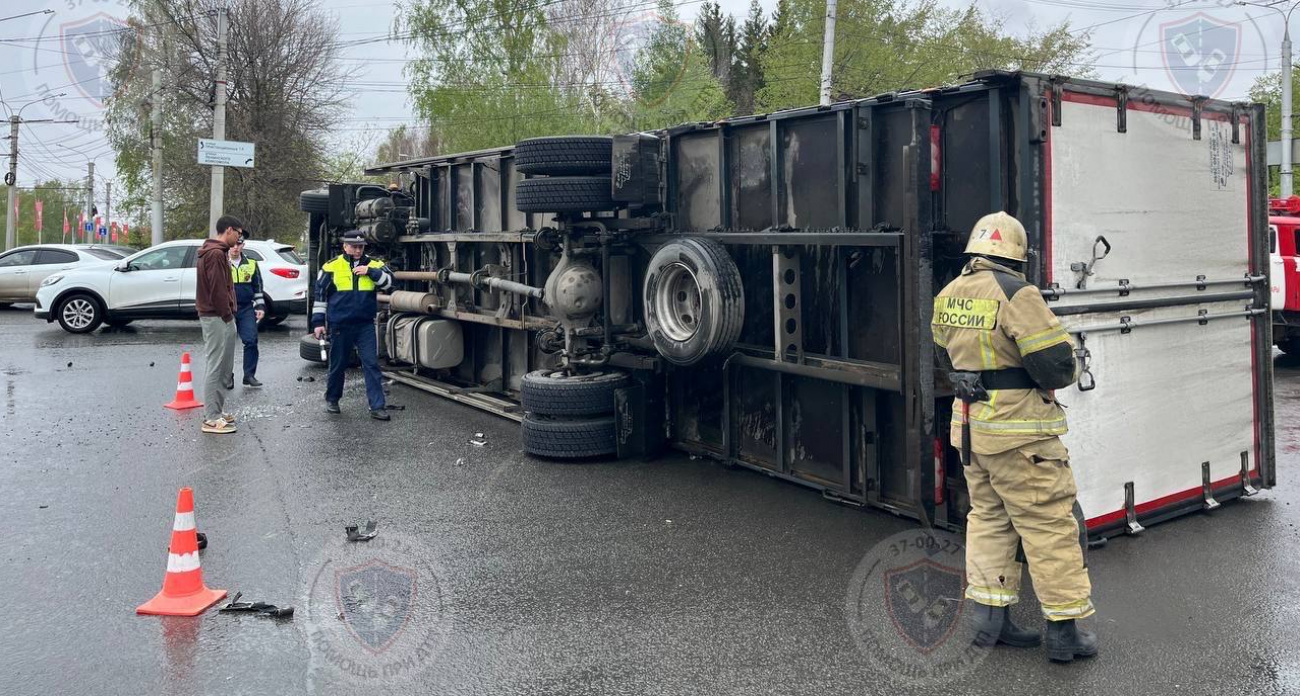 В Чебоксарах грузовик попал в ДТП: опрокинулся набок на кольце