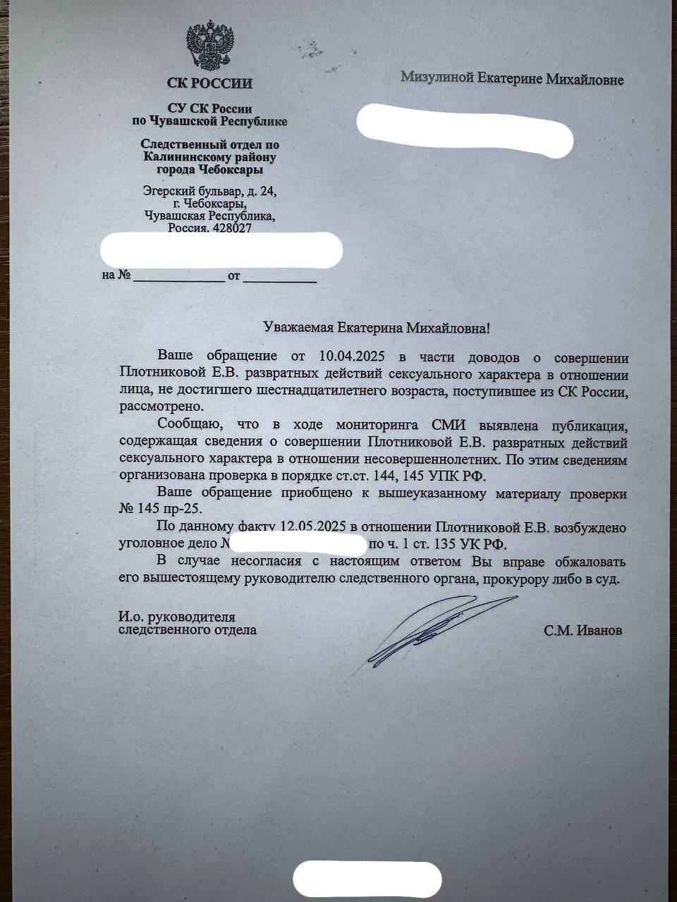 Однако оправдания ей не помогли. Екатерина Мизулина написала заявление в полицию, а сегодня поделилась ответом, который ей прислали из СК по Чувашии. Следователи сообщили, что провели проверку и обнаружили публикации, за которые возбудили против Аленушки уголовное дело по статье "Развратные действия в отношении лица, не достигшего шестнадцатилетнего возраста". Уголовным кодексом за нее предусмотрены наказания вплоть до длительных тюремных сроков.