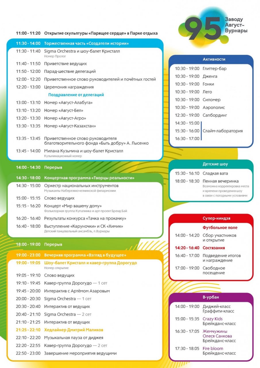 С 14:30 стартует дневной концерт с оркестром, фолк-группой и детскими номерами. Вечером, с 19:00 до 23:00 – главное шоу. На сцену выйдут шоу-балет "Кристалл", кавер-группа "Дорогуго" и хедлайнер вечера – Дмитрий Маликов.