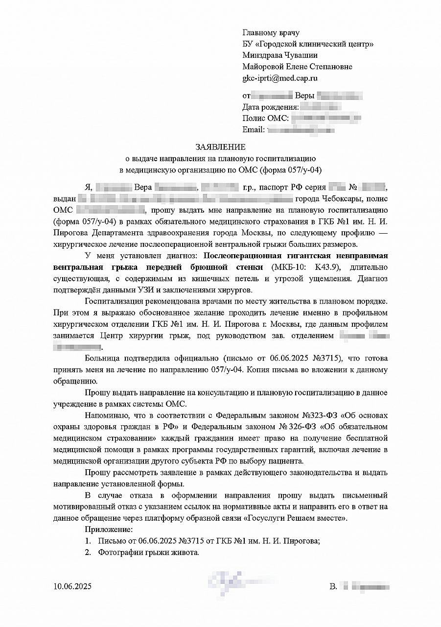 Основание для отказа, озвученное представителями учреждения: якобы московская клиника "не входит в территориальную программу ОМС Чувашской Республики". Однако это противоречит федеральному законодательству. Если клиника участвует в программе государственных гарантий (а ГКБ № 1 им. Пирогова в нее входит), пациент имеет право на лечение там по ОМС при наличии показаний и согласия принимающей стороны.