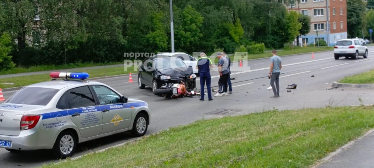 Утром 27 июня напротив здания администрации Московского района произошло дорожно-транспортное происшествие с участием легкового автомобиля и мотоцикла.