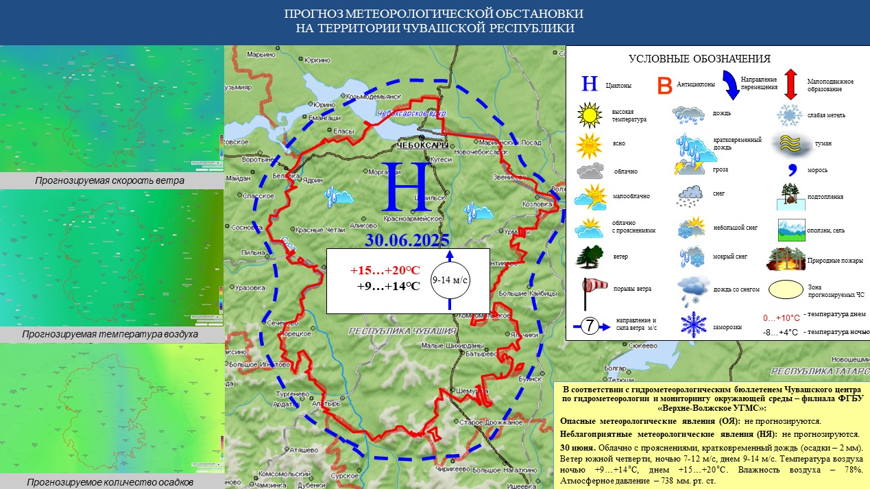 30 июня, по данным Чувашского центра по гидрометеорологии и мониторингу окружающей среды, жителей Чувашии ожидает переменная облачность, возможен небольшой дождь до 2 мм. Ветер южной четверти, днем ветер усилится от умеренного до крепкого.
