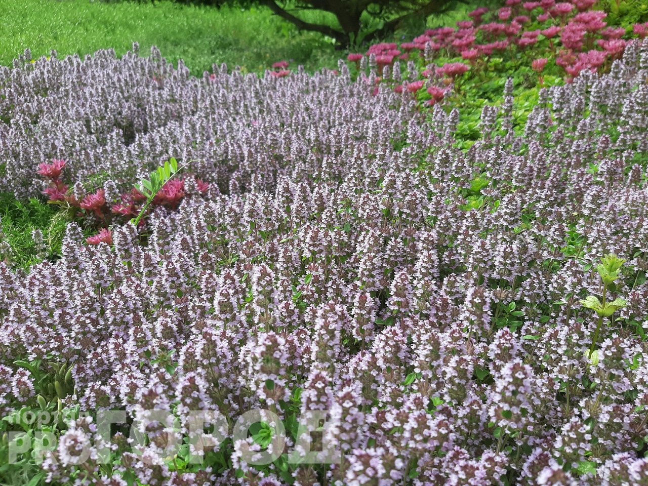 Ароматный "ковер", устойчив к вытаптыванию, морозам, засухе, быстро вытесняет однолетние сорняки. Лечебные свойства — можно использовать для чая. Чабрец отпугивает муравьев, которые часто разносят семена сорняков.
