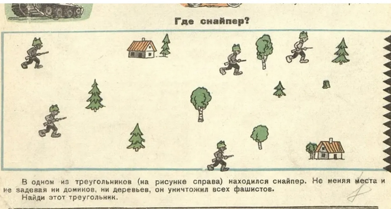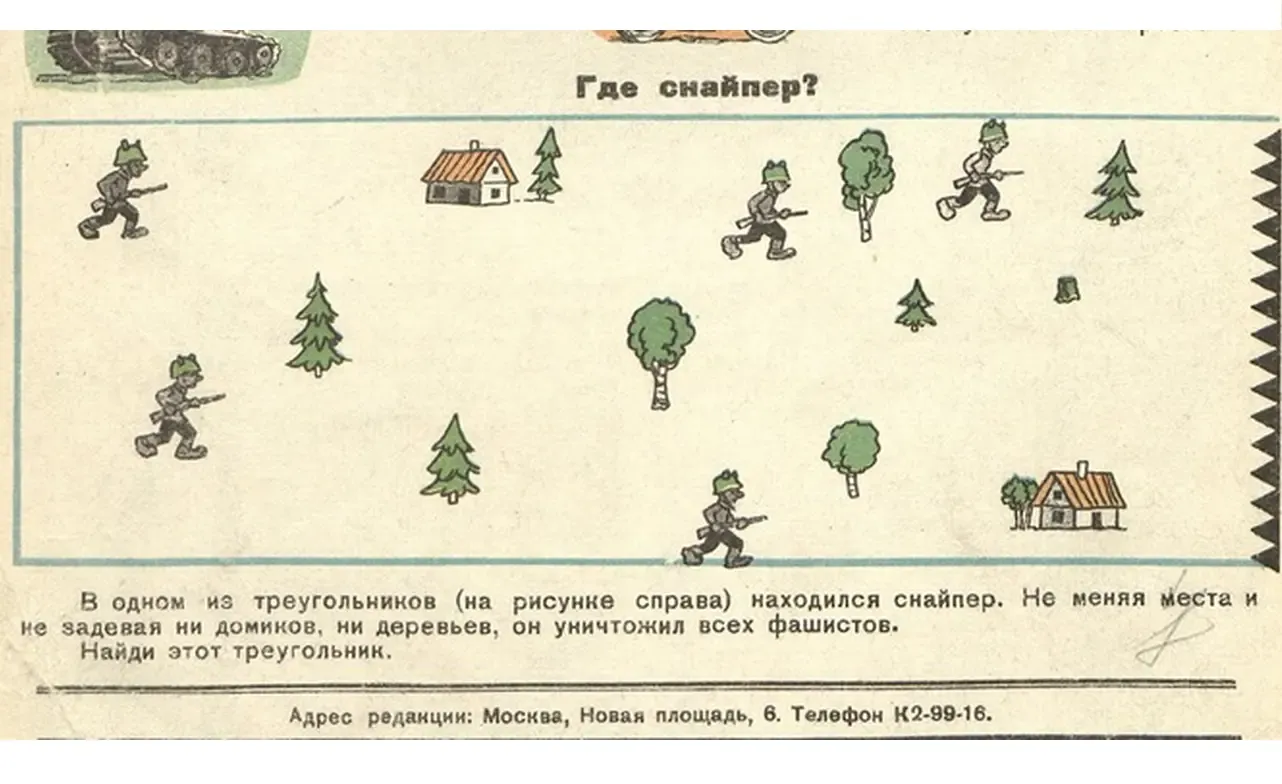 В одном из выпусков военного времени редакция предложила читателям необычную задачу: на иллюстрации изображено поле боя, где фашисты готовятся к атаке на советские позиции. Красноармеец-снайпер спрятался в одном из треугольников и должен поразить всех врагов, не меняя позиции и не задевая ни домов, ни деревьев. У него всего пять патронов — промахов быть не должно.