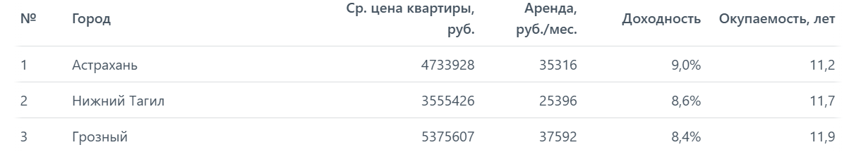Например, самую большую прибыль при сдаче жилья можно получить в Астрахани – доходность 9 % в год, квартиру можно окупить примерно за 11 лет. В Грозном и Череповце показатели чуть ниже – доход 8,4 % и 8,2 %, срок окупаемости – 12 лет. В Москве ситуация другая: доход – только 3,8 % в год, а для полной окупаемости потребуется более 26 лет.