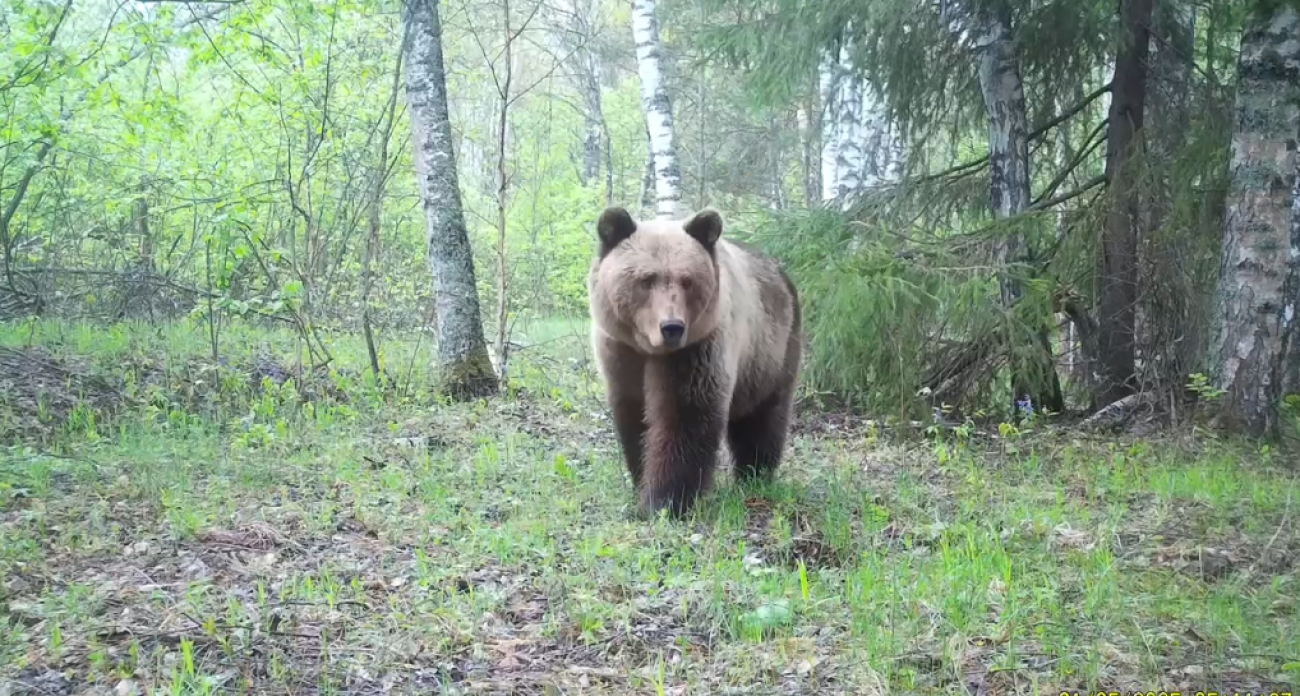 В заповеднике "Присурский" фотоловушка сняла двух медведей, которые отличаются по размеру и цвету шерсти. На заднем плане видна береза с темными полосами на белой коре, похожими на отметки ростомера, что помогает лучше понять разницу в росте животных. Медведей заинтересовали еловые ветки, рядом с которыми они подошли к камере, и она сработала.