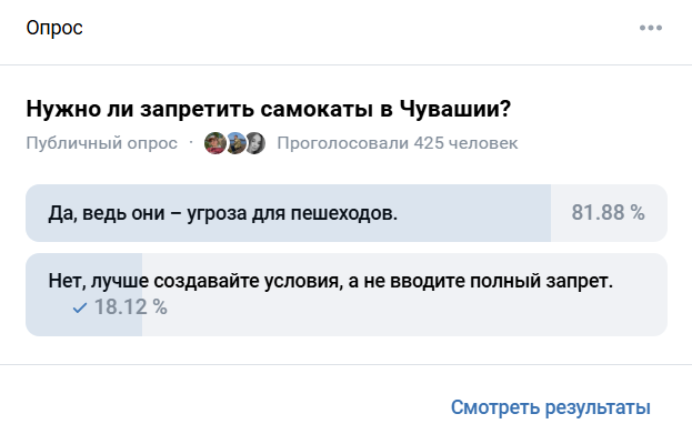 21 июля "Про Город" устроил опрос, нужны ли такие запреты в Чебоксарах и всей Чувашии. На момент подведения итогов проголосовало более 400 человек. Большинство опрошенных жителей считает, что самокаты опасны и их следует запретить.