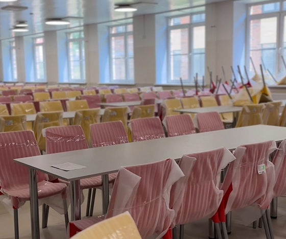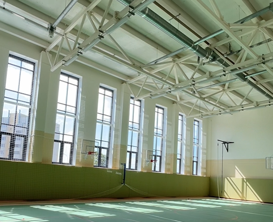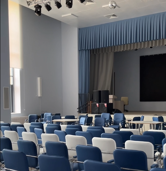 В самой школе есть два спортзала, столовая, актовый зал с акустикой и не только.
