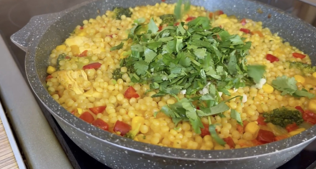 Для ужина на скорую руку подойдет рецепт птитима с курицей и овощами. Для приготовления понадобятся куриное филе, лук, специи, замороженная овощная смесь, макароны птитим, чеснок, немного кипятка, соль и свежая зелень. Птитим — это паста из твердых сортов пшеницы, крупнее кускуса, хорошо сохраняет форму на сковороде и не слипается.