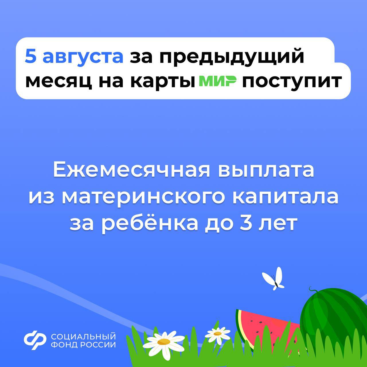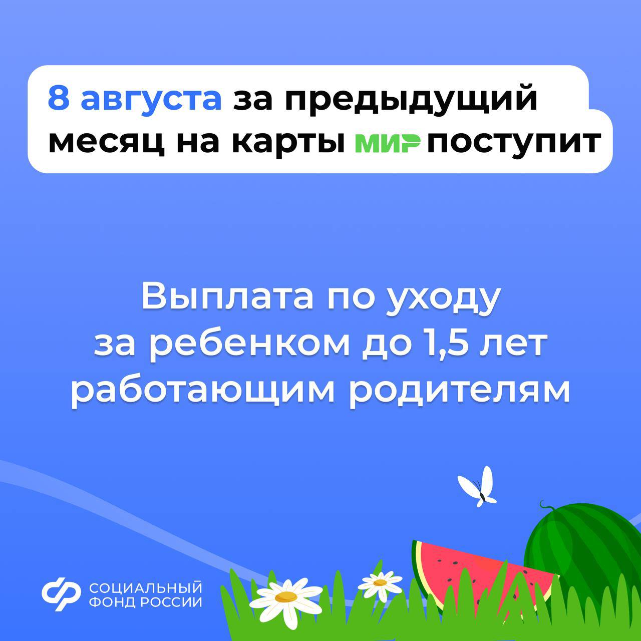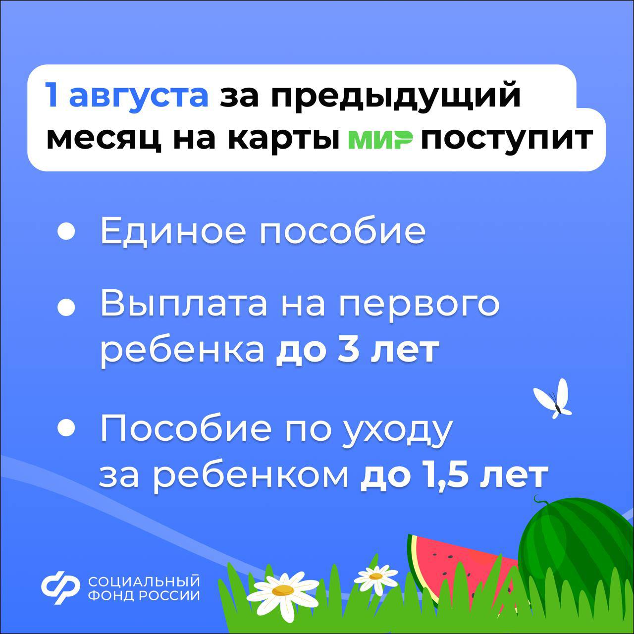 Выплаты семьям с детьми поступят на банковские карты и счета 1, 5 и 8 августа. Переводы приходят за прошлый месяц, поэтому в августе поступают деньги за июль. Если выплата приходится на выходной день, то средства переводят заранее, в ближайший рабочий день, напоминают в СФР. Поэтому в этом месяце выплата единого пособия осуществляется 1-го, а не 3-го числа.