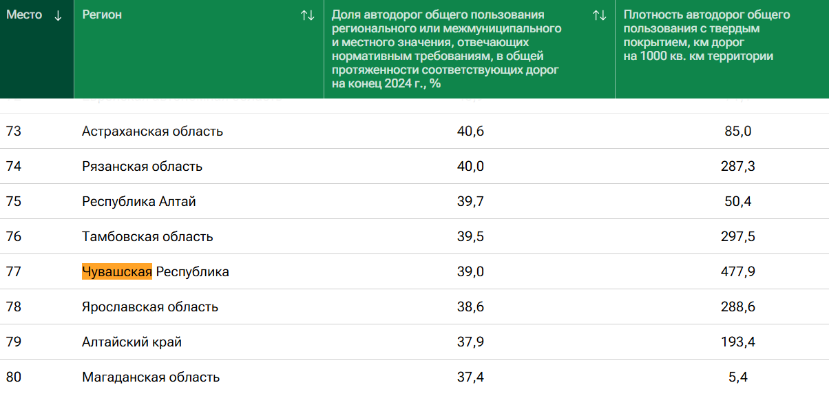 Всего в рейтинге 89 регионов. Чувашия среди них на 77-м месте. Только 39 % дорог региона отвечает требованиям.