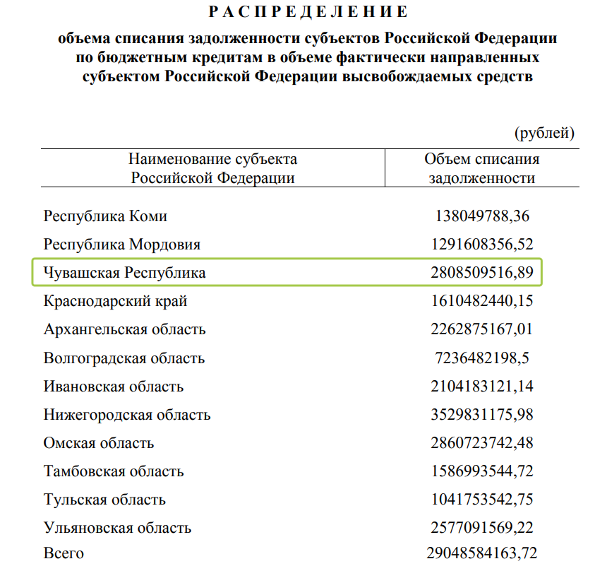 Премьер-министр Михаил Мишустин подписал документ, который позволяет 12 регионам списать часть долга по бюджетным кредитам на общую сумму более 29 миллиардов рублей. В их числе – Коми, Мордовия, Чувашия, Краснодарский край, Архангельская, Волгоградская, Ивановская, Нижегородская, Омская, Тамбовская, Тульская и Ульяновская области. В частности, нашей республике спишут 2 808 509 517 рублей.