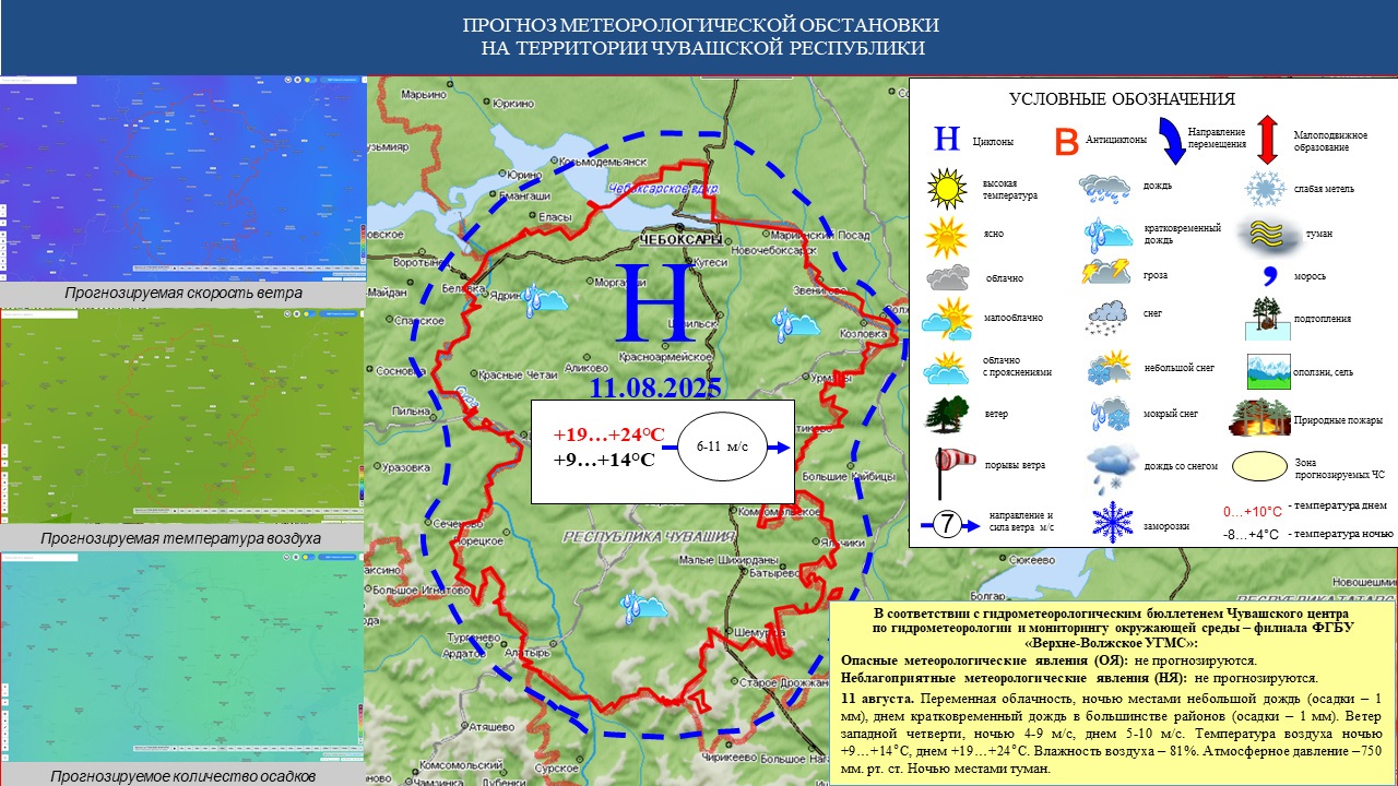11 августа, по данным Чувашского центра по гидрометеорологии и мониторингу окружающей среды, жителей Чувашии ожидает переменная облачность, ночью местами небольшой дождь до 1 мм, днем кратковременный дождь до 1 мм. Ветер западной четверти от слабого до свежего, днем от умеренного до сильного. Ночью и днем возможен туман.