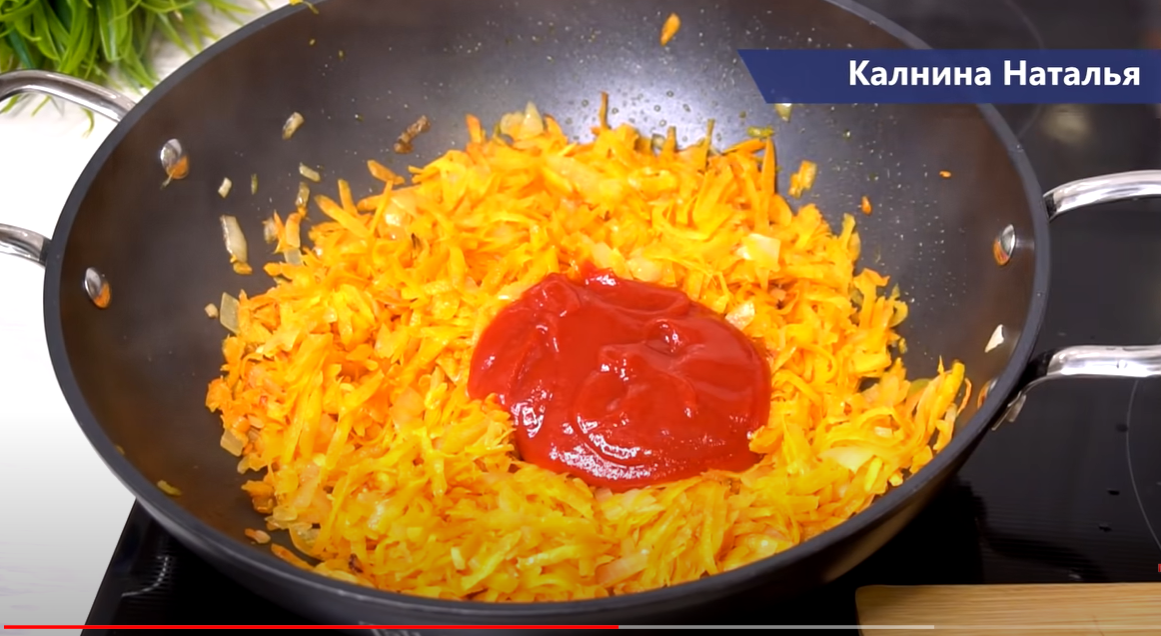 Репчатый лук нарежьте мелкими кубиками, а морковь натрите на крупной терке. Обжарьте овощи на растительном масле до мягкости, затем добавьте томатный кетчуп, соль и перец по вкусу. Если вместо кетчупа вы используете томатную пасту, не забудьте добавить столовую ложку 9% уксуса для придания блюду пикантности.