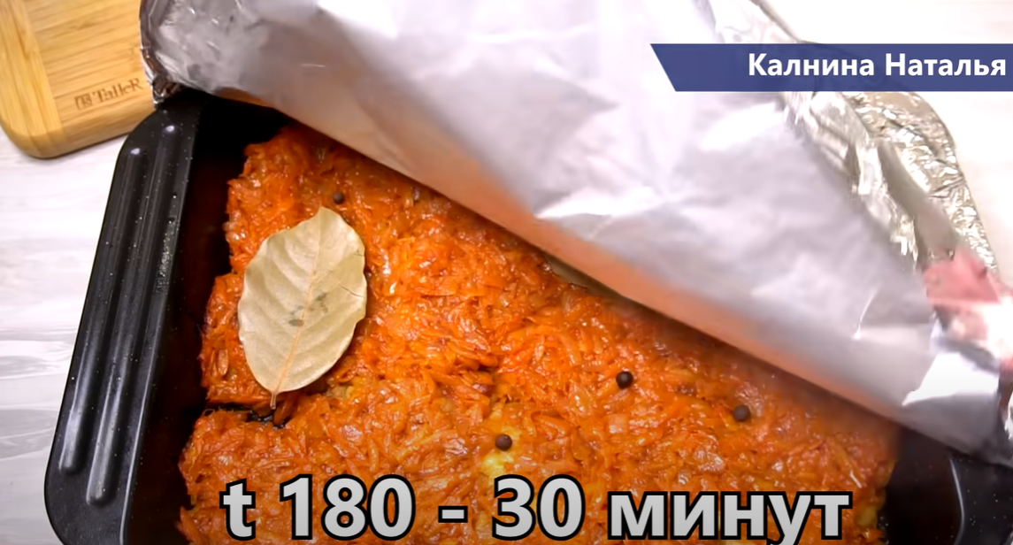 На противень аккуратно выложите обжаренные кусочки минтая, сверху равномерно распределите овощную смесь. Добавьте лавровый лист и горошины душистого перца. Накройте противень фольгой и поместите его в духовку, предварительно разогретую до 180°C, на 30 минут.
