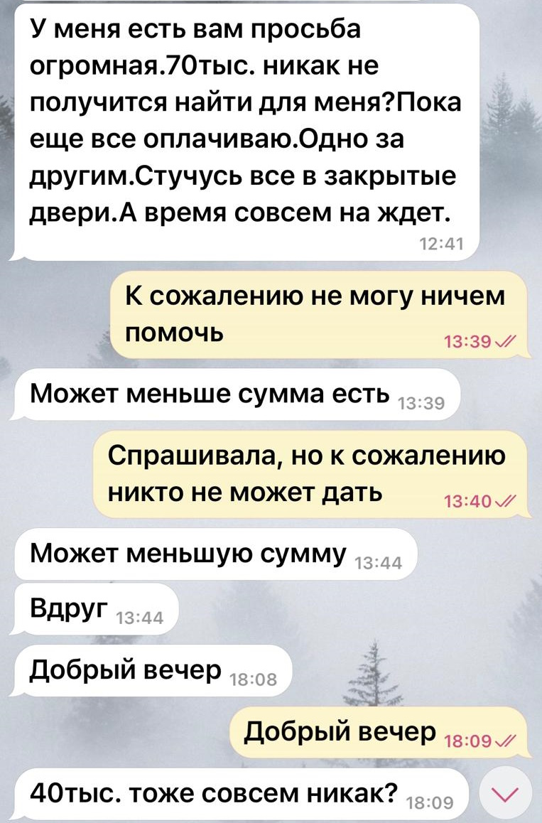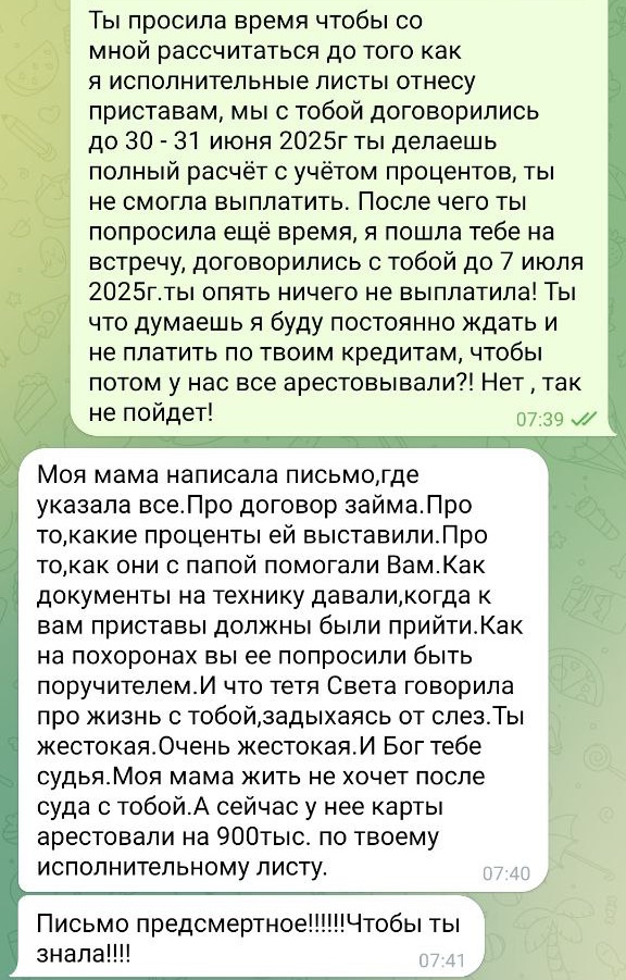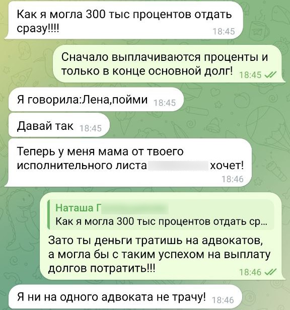 "Она также жаловалась на патовую ситуацию и слезно просила денег в долг. В итоге я не просто отдала ей последние деньги, а набрала кредитов. Вернуть деньги она обещала до декабря 2024 года. Денег так и нет, одни обещания. Все это серьезно сказалось на финансовом положении семьи", – говорит Ирина.