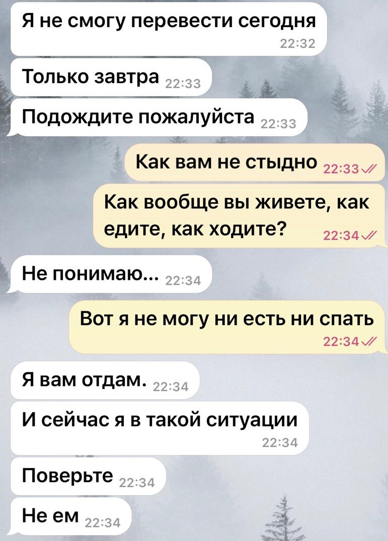 "Мне она угрожала каким-то мифическим человеком, который якобы приедет с СВО, чтобы с нами разобраться в силовом формате. Когда понимала, что это все можно показать в МВД, она извинялась. Позже она подала в суд уже на меня, обвинила в вымогательстве, что я требую от нее деньги, хотя это мои деньги", – говорит Евгений.