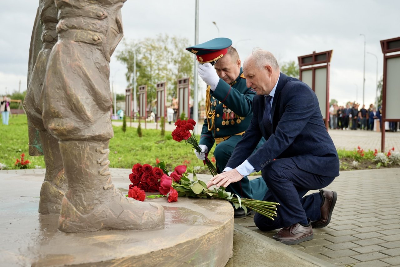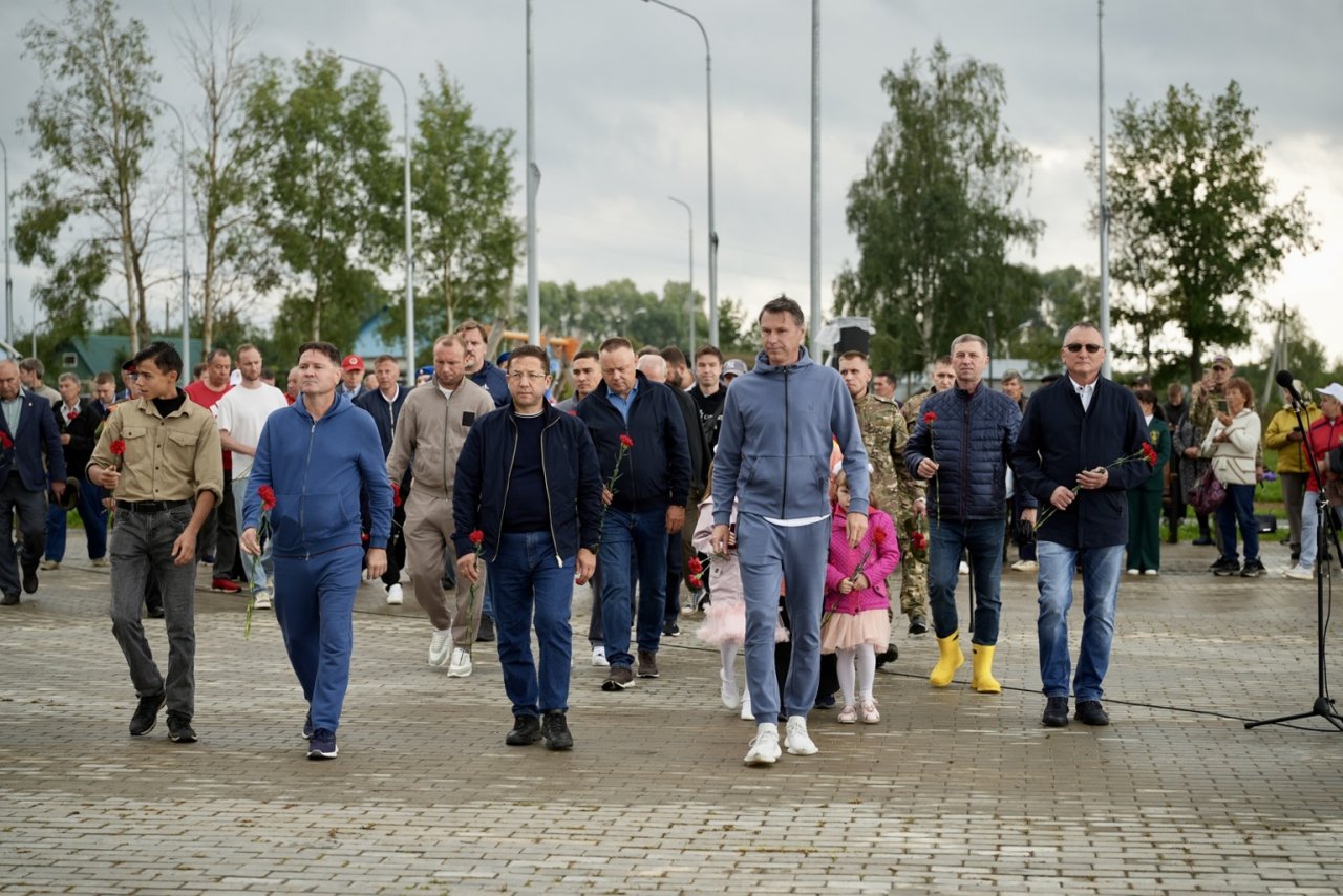 Участники почтили память павших минутой молчания и возложили цветы у монумента воинам специальной военной операции.