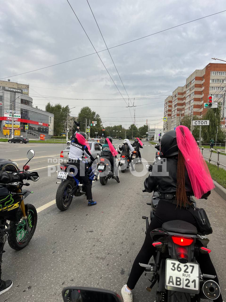 Оказалось, что это был не обычный мотопробег, а креативный девичник двух невест из Новочебоксарска и Чебоксар. Девушки отпраздновали предстоящее торжество пробегом по двум городам, собрав подруг на мотоциклах. Украсив шлемы фатой, 13 девушек проехали по улицам.