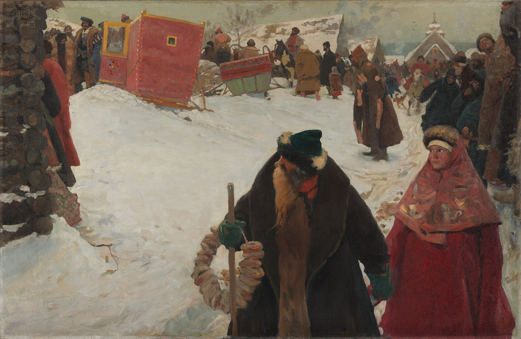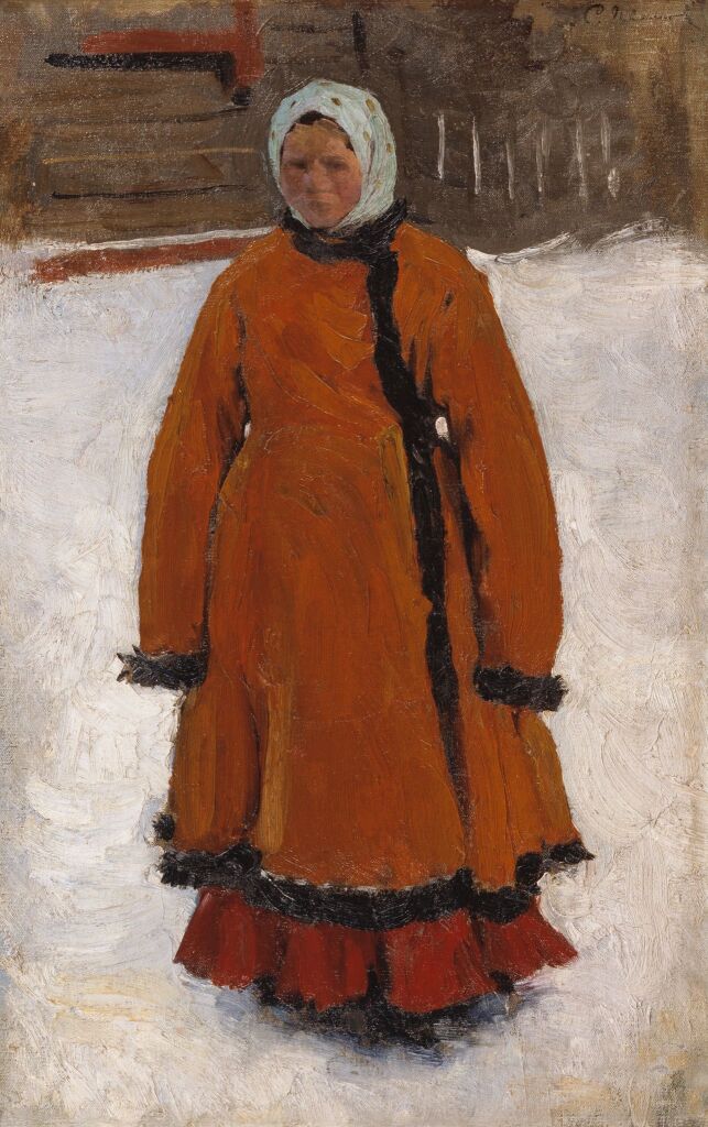Картины "Девушка в красной шубке" и "Приезд иностранцев" руки первого из них изображают людей и быт глубокой русской старины. Работая над темами допетровской Руси, Сергей Васильевич специально выезжал в отдаленные российские губернии, где подолгу изучал уклад жизни русских крестьян, которые тогда еще мало восприняли новшества эпохи модерна и сохраняли свою изначальную самобытность. И весьма примечательна в этом отношении вторая картина, иллюстрирующая как раз-таки столкновение русской патриархальности с выходцами из чуждой для нее культуры европейских послов.