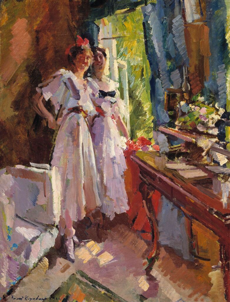 Полотно Константина Коровина "У открытого окна. Портрет дочерей Ф. И. Шаляпина", которое также смогут увидеть чебоксарцы, посвящено уже более поздним временам. Эта картина, в полной мере воспринявшая характерные черты импрессионизма, нова и в плане манеры письма. Как можно понять из названия, на ней изображены дочери известнейшего оперного певца, которые здесь выступают проводниками атмосферы молодости и счастья.