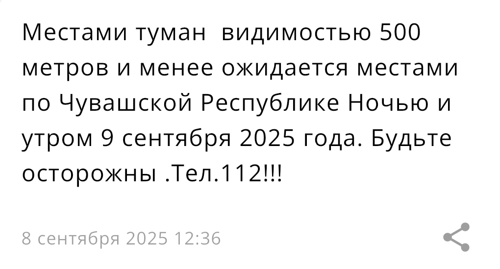 В Чувашии ночью и утром 9 сентября ожидается туман на отдельных участках, видимость может снижаться до 500 метров и менее. Всем рекомендуется проявлять осторожность, особенно водителям и пешеходам, чтобы избежать опасных ситуаций на дорогах и вблизи транспортных узлов. Об этом сообщают в приложении МЧС России.