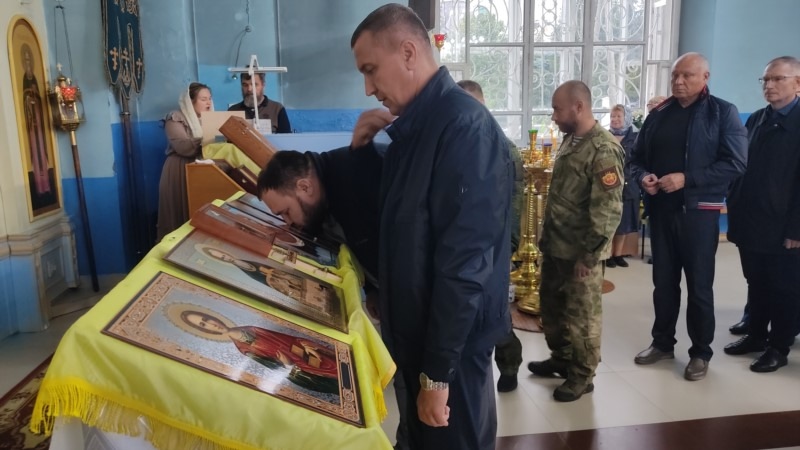 После передачи святынь настоятель Николай Медведев провел молебен о защите российского воинства и даровании победы. На службе были правоохранители и военные, участники спецоперации, их родственники и прихожане.