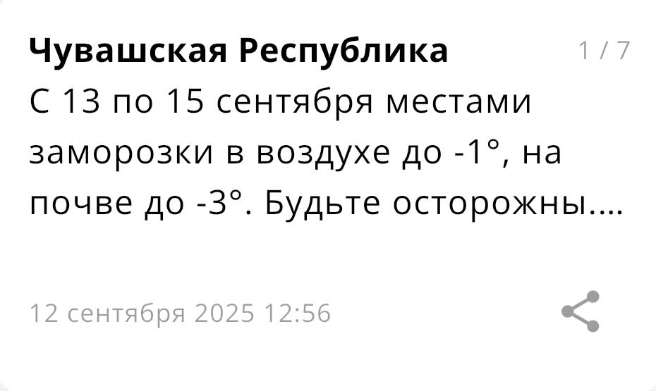 С 13 по 15 сентября в некоторых районах Чувашии ожидаются короткие заморозки. Температура воздуха может снижаться до -1 °С, а на почве – до -3 °С.