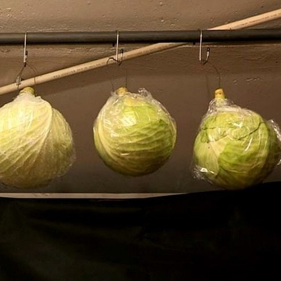 • Подвешивание: Кочаны, подвязанные к потолку (стеблем вверх), не обрезают стебель, можно с корнями.