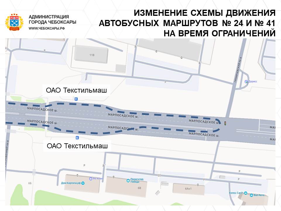 Автобусы № 24 и № 41 временно не будут ехать по Гремячевскому и Соляному проездам. Их конечная – остановка "ОАО Текстильмаш", разворот – на пересечении Марпосадского шоссе и Гремячевского проезда.
