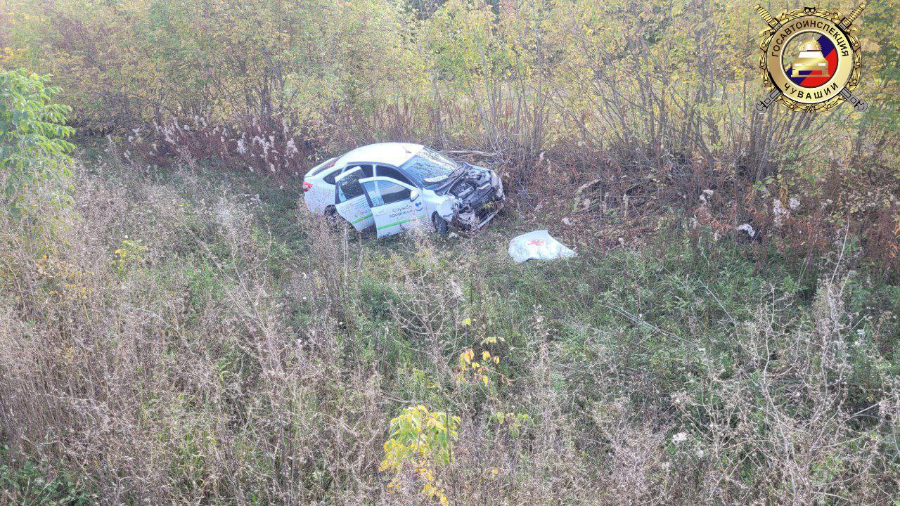 На трассе в Чувашии Lada "Службы здоровья" оказалась в кювете и опрокинулась