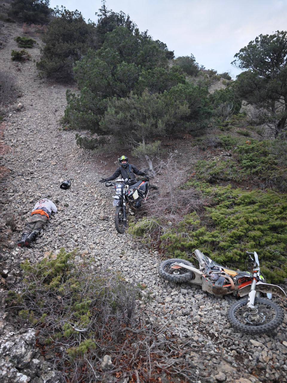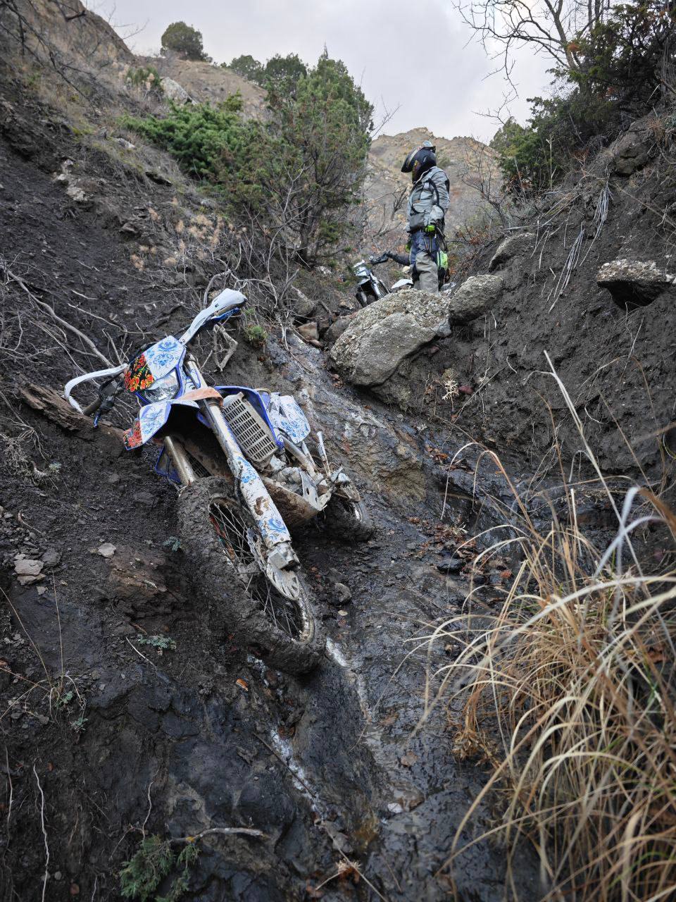 «Я поднимался в гору за Колей, взял немного неверную траекторию, и мотоцикл встал на заднее колесо и упал на меня. Я к нему еще не до конца привык – слишком мощный. Он был полон бензина, с багажом – так придавил, что в глазах потемнело. Я вылез из-под него как-то на адреналине. Было так больно, что я решил, что сломал ключицу и ребра. От более страшных последствий меня спасла экипировка. Я шел пешком, а парни на веревке вытаскивали мой мотоцикл полдня, потом по очереди перегоняли его. Потом мы увидели, что надвигается дождь, а если нас накроет, то станет невозможно двигаться дальше, так как камни станут скользкими. Пришлось, несмотря на боль, сесть за руль мотоцикла. Мы поторопились покинуть ущелья, нам надо было выйти на дорогу. Только вышли, забродили реку, поднялись – и пошел дождь. Успели!».