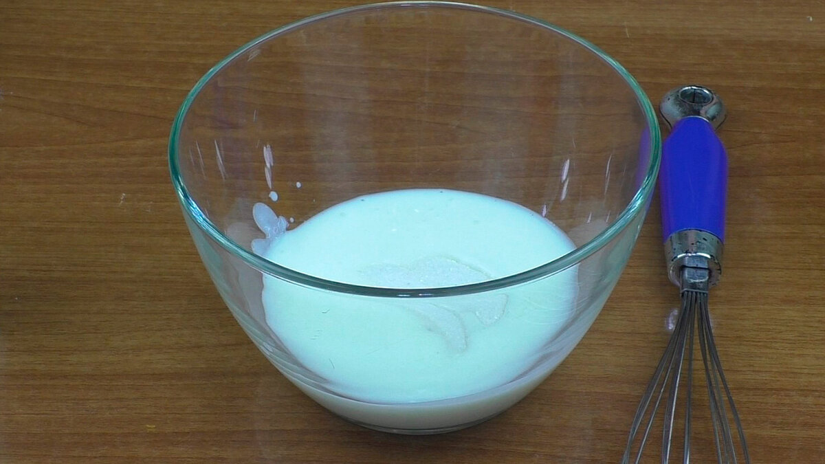 3. Добавление яйца и перемешивание: Разбейте одно куриное яйцо в кефирную смесь. С помощью венчика или обычной вилки немного взбейте все ингредиенты до однородности. Вы заметите, как на поверхности начнут появляться легкие пузырьки – это сода активно реагирует с кефиром, создавая воздушную основу для теста.