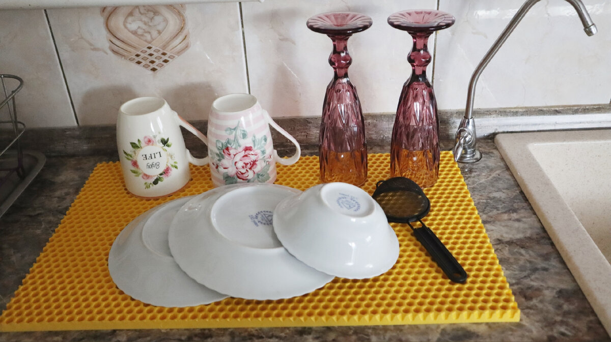 Большой вариант можно положить у входной двери — грязь и вода останутся в ячейках, а пол останется чистым. Компактный коврик можно использовать как сушилку для посуды: посуда стоит на рельефной поверхности, вода стекает в ячейки, а после хранения коврик легко промыть и высушить.