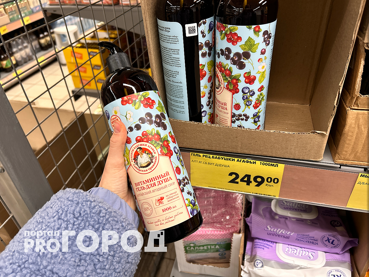 Первое, что поразило, — гель для душа «Рецепты бабушки Агафьи». Огромная бутылка объемом 1 литр стоит всего 249 рублей. Пахнет приятно ягодами, пенится густо, хватает на несколько месяцев. Для семьи — отличная находка.