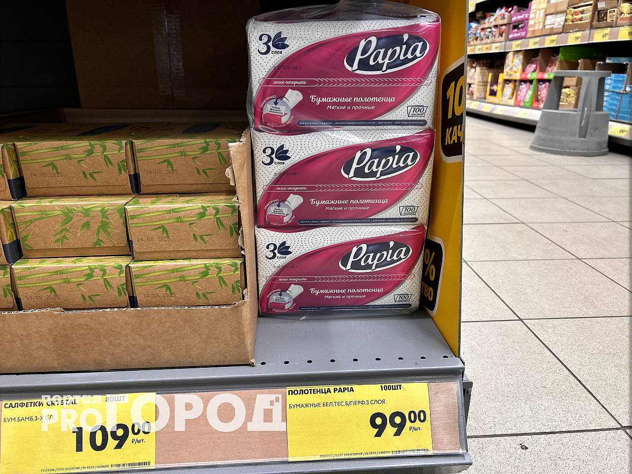 Далее — бумажные полотенца «Papia». Упаковка из 100 штук стоит лишь 99 рублей. Это трёхслойные, плотные полотенца, которые хорошо впитывают влагу и не разваливаются. Я использую их на кухне, для уборки и даже с детьми — универсально и надёжно.
