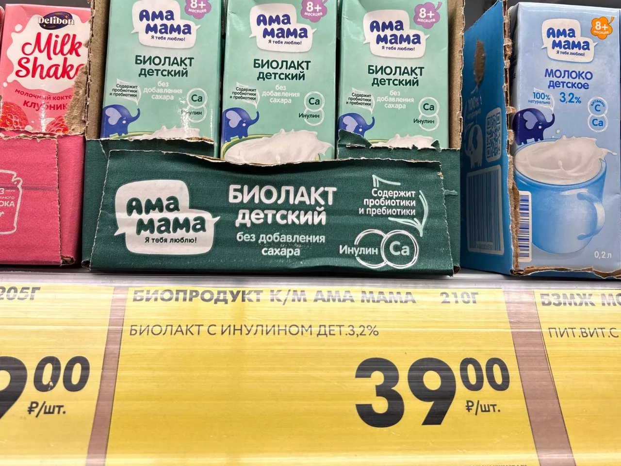 Биопродукт «Ама мама» за 39 рублей — это мягкий кисломолочный напиток для детей, напоминающий айран. Полезные бактерии в составе улучшают пищеварение и укрепляют иммунитет. Удобная бутылочка позволяет брать напиток на прогулку или давать ребенку в сад. На полках стоит рядом с молочными десертами, но польза от него несравнимо выше.