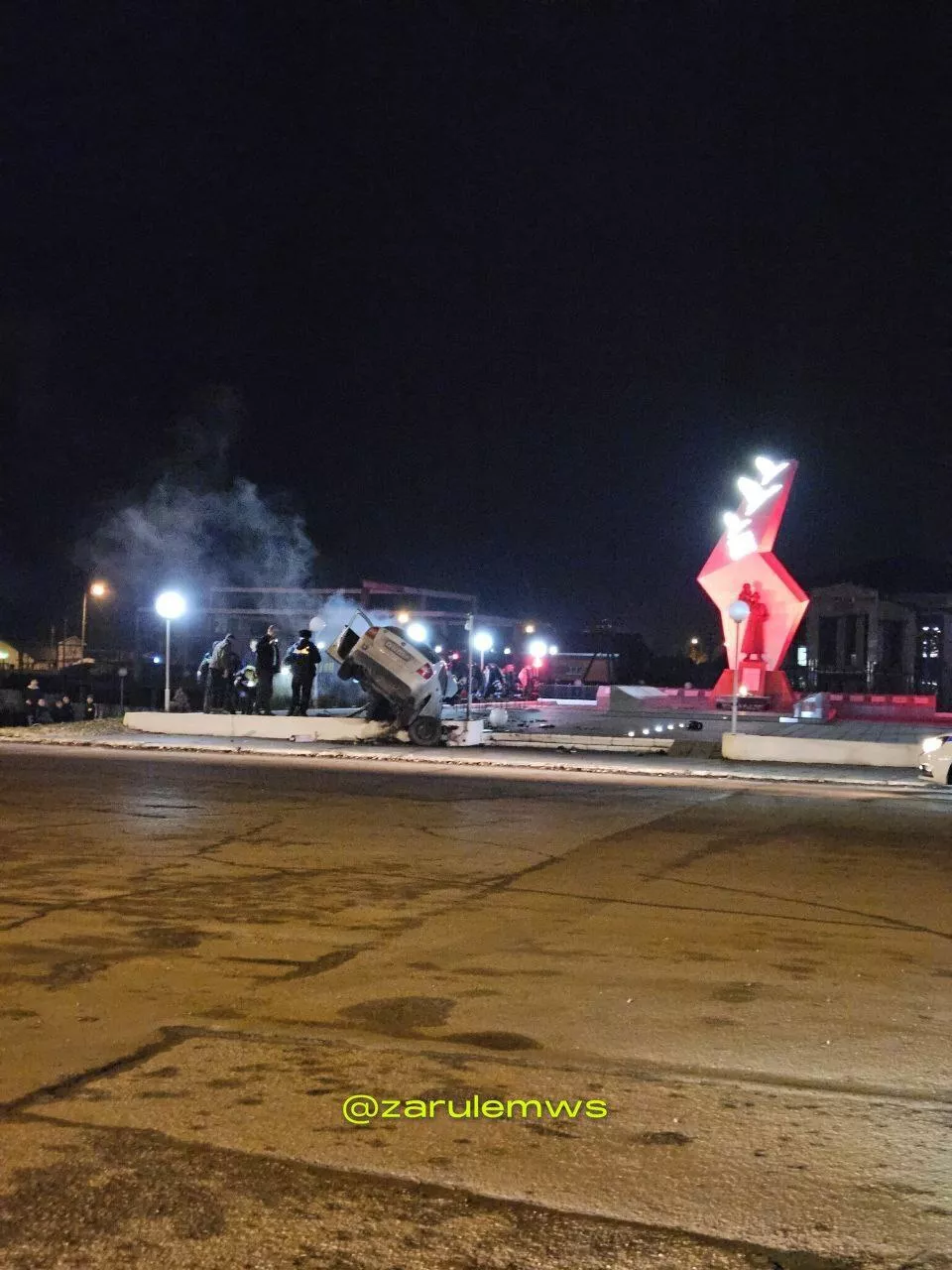 Предварительно известно, что белая "Шкода Рапид" ехала по проспекту Ленина, но пропустила поворот и вылетела на территорию при Вечном огне. От удара машина уткнулась в бетон и буквально повисла в воздухе, лишившись одного колеса.