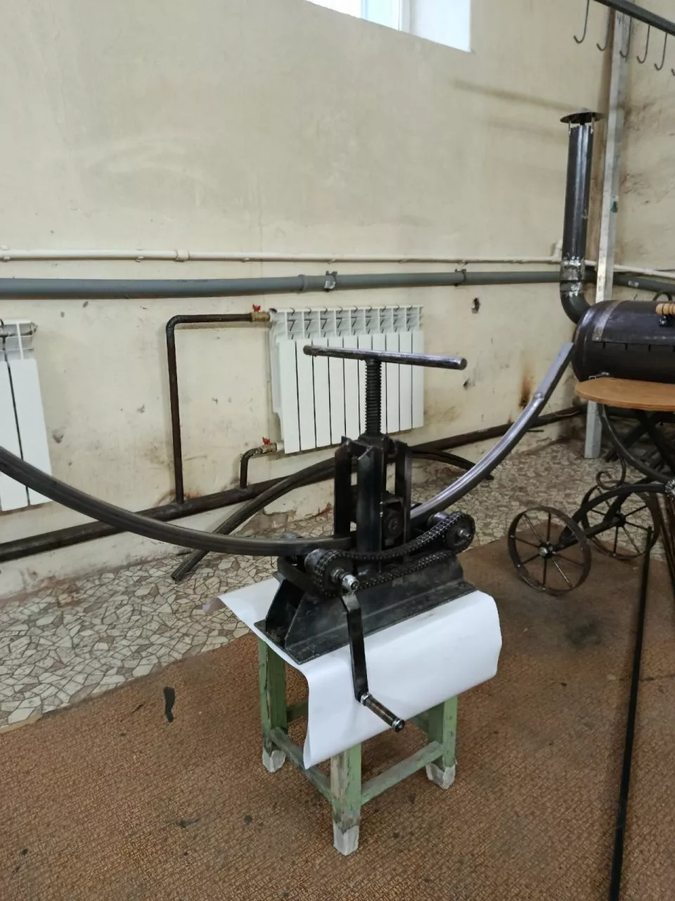 Владимир никогда не останавливается – снова и снова дорабатывает и улучшает уже сделанные машины и придумывает новые. Например, собрал инструмент для загибания труб и назвал его трубогиб.